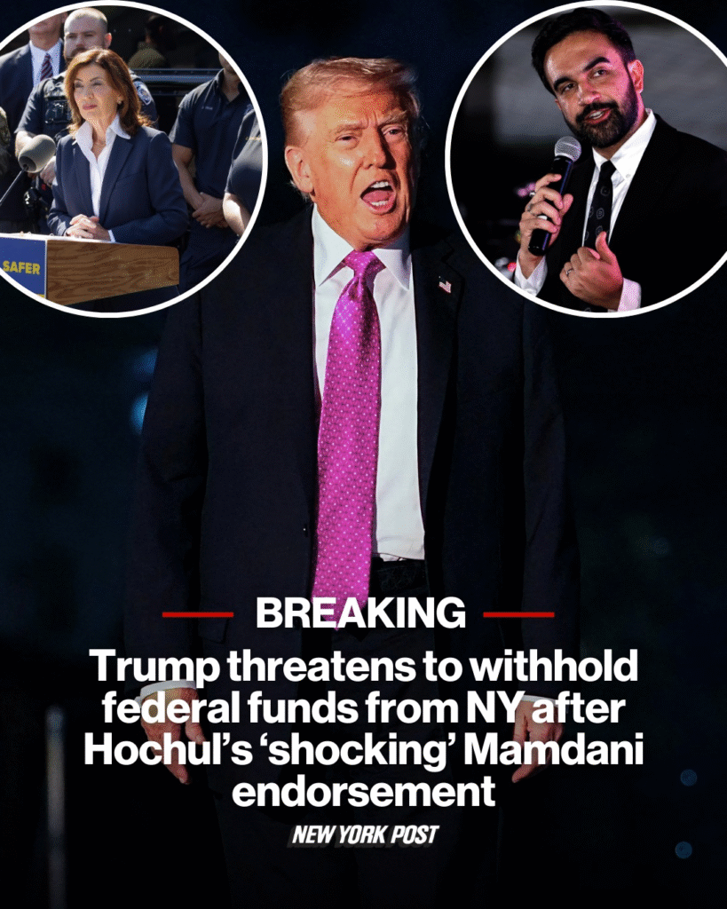 President Trump threatened early Monday to withhold federal funds from New York after Gov. Kathy Hochul’s “shocking” endorsement of socialist Zohran Mamdani to be the Big Apple’s mayor.