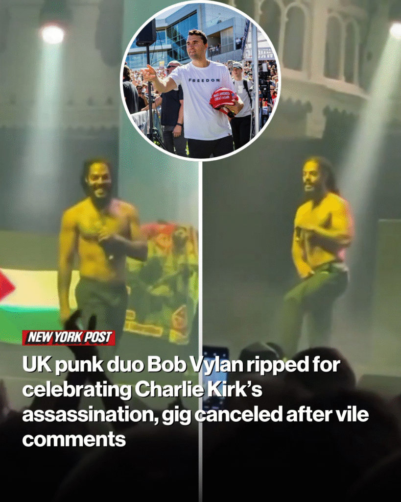 Bob Vylan has already had at least one show canceled in disgust at the vile remarks made at a packed show at Amsterdam’s Club Paradiso on Saturday, just days after married dad Kirk, 31, was shot dead at a debate.
