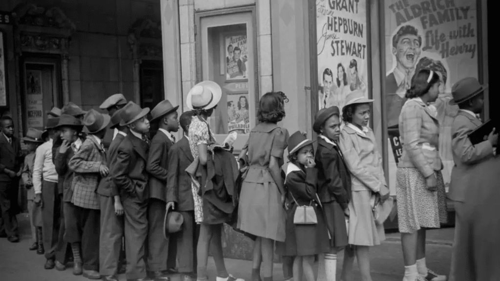 The photo captures a group of children waiting in line outside a movie theater in Chicago, providing a fascinating window into a bygone era.