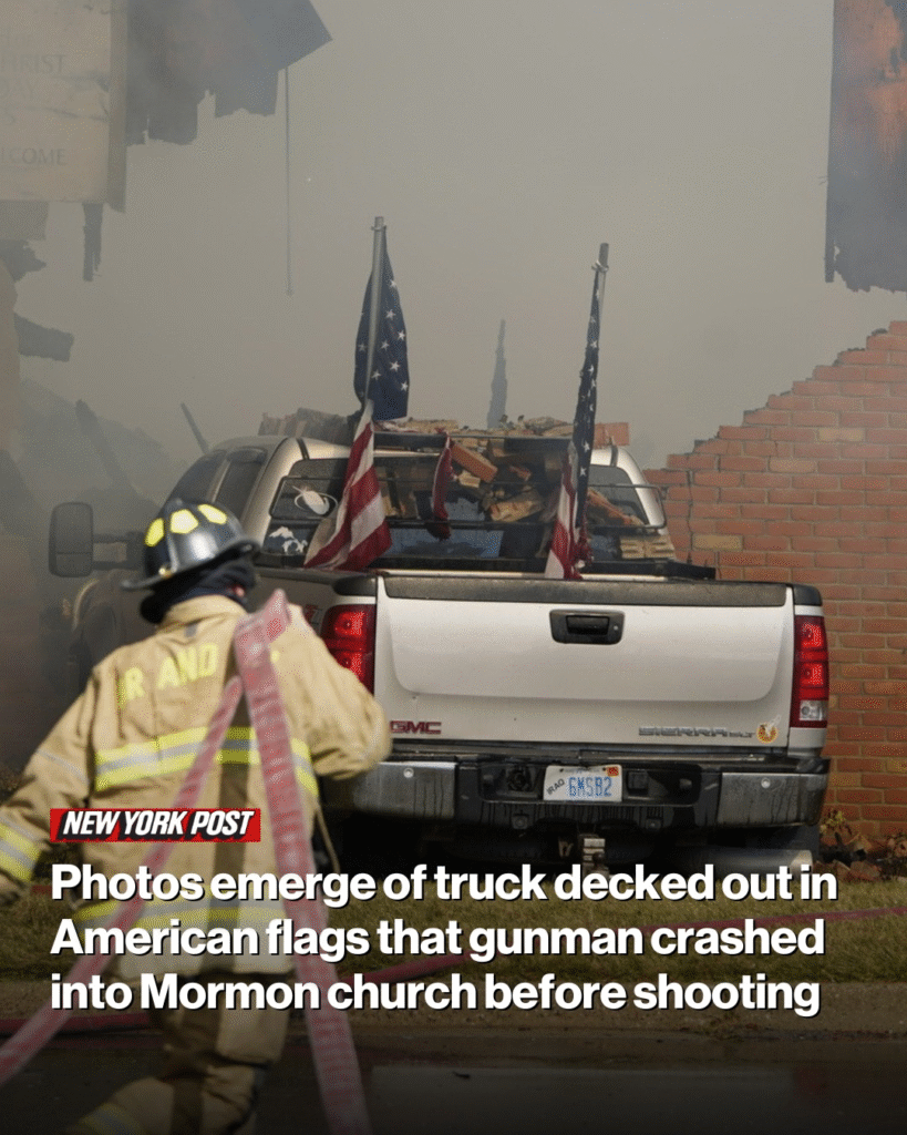 Photos have emerged of the pickup truck with two large American flags that rammed into a packed Latter-day Saints church in Michigan before a gunman unleashed a deadly shooting spree Sunday.
