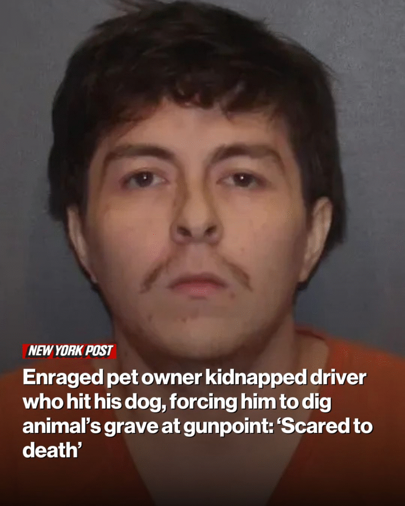 An unhinged Texas man outraged that his pet dog had been run over held the driver hostage at gunpoint and forced him to dig to the the animal’s grave, according to police.