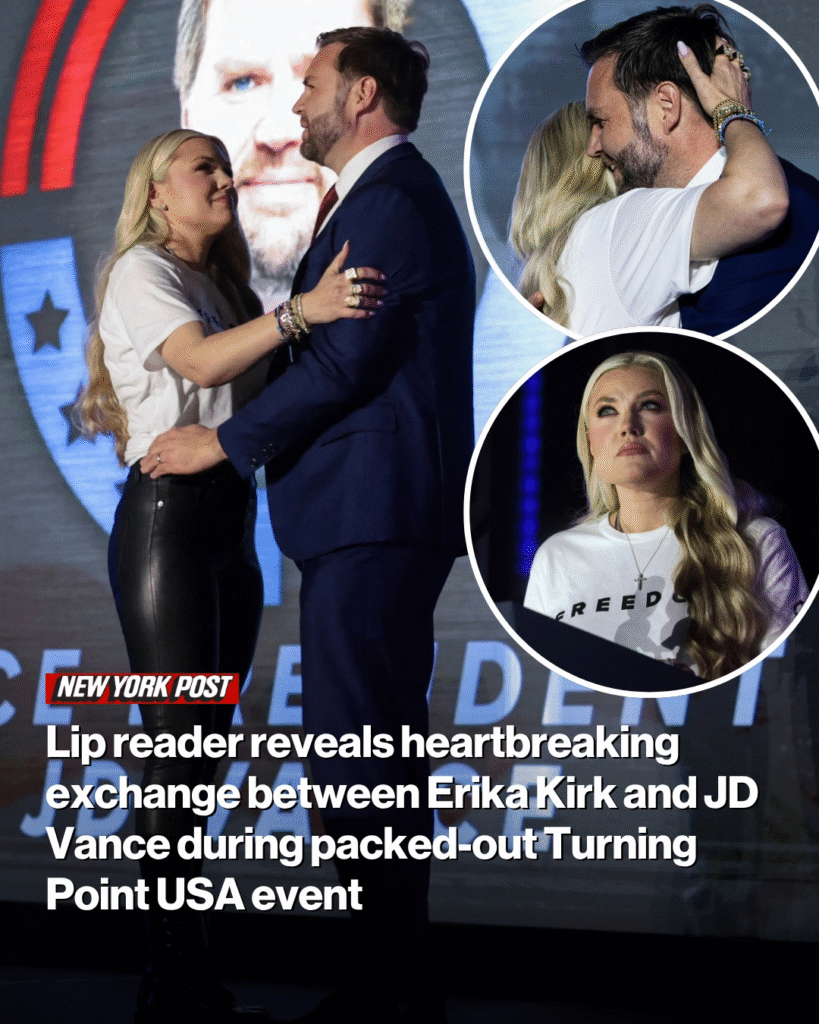 A lip reader revealed the heartbreaking exchange between Charlie Kirk’s widow, Erika, and Vice President JD Vance during her first Turning Point USA campus event following her husband’s assassination.